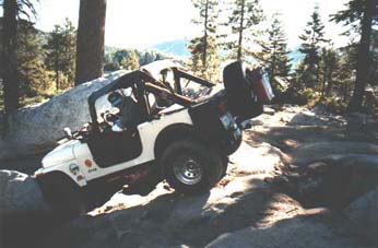 beurt. Hij reed zijn CJ-8 meteen op de eerste grote rots vast. De Jeep rustte